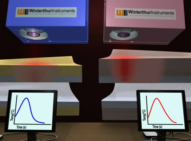 Coatmaster在線非接觸式實時測厚系統(tǒng)的測試原理為熱測法原理。該設備通過一種輕微的脈沖來加熱涂層表面。開始預熱幾度后,涂層表面因熱量擴散到涂層和基材的較深處,然后冷卻下來。涂層越薄(假定其導熱系數(shù)比基材低),表面溫度下降的速度越快,因此得出涂層厚度,從而實現(xiàn)非接觸式無損隔空測量。