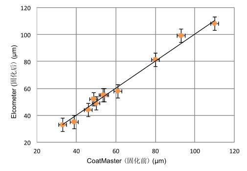 固化前CoatMaster測量值與固化后渦電流比較測量值進行比較。 測量值的相關(guān)性是r2 = 0.96,顯示非常好的相關(guān)性。使用CoatMaster重復(fù)測量的變化系數(shù)為1%(測量距離為15 cm),渦電流的變化系數(shù)為5%