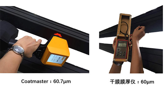 結(jié)論:在鋁型材上相同位置測試數(shù)據(jù)接近,且Coatmaster重復(fù)性和精度要更好;