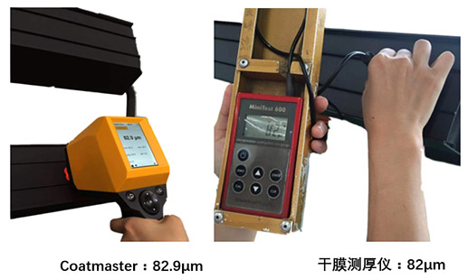 用兩種膜厚測試方法在鋁型材上同一位置分別測試未固化和已固化的膜厚