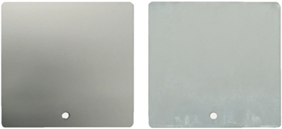 圖二:涂層厚度為11μm的測(cè)試板:沒(méi)有經(jīng)過(guò)鹽霧腐蝕測(cè)試(左圖)和根據(jù)DIN EN ISO 9227-NSS鹽霧試驗(yàn)2500小時(shí)后(右圖)。右圖測(cè)試板沒(méi)有腐蝕現(xiàn)象